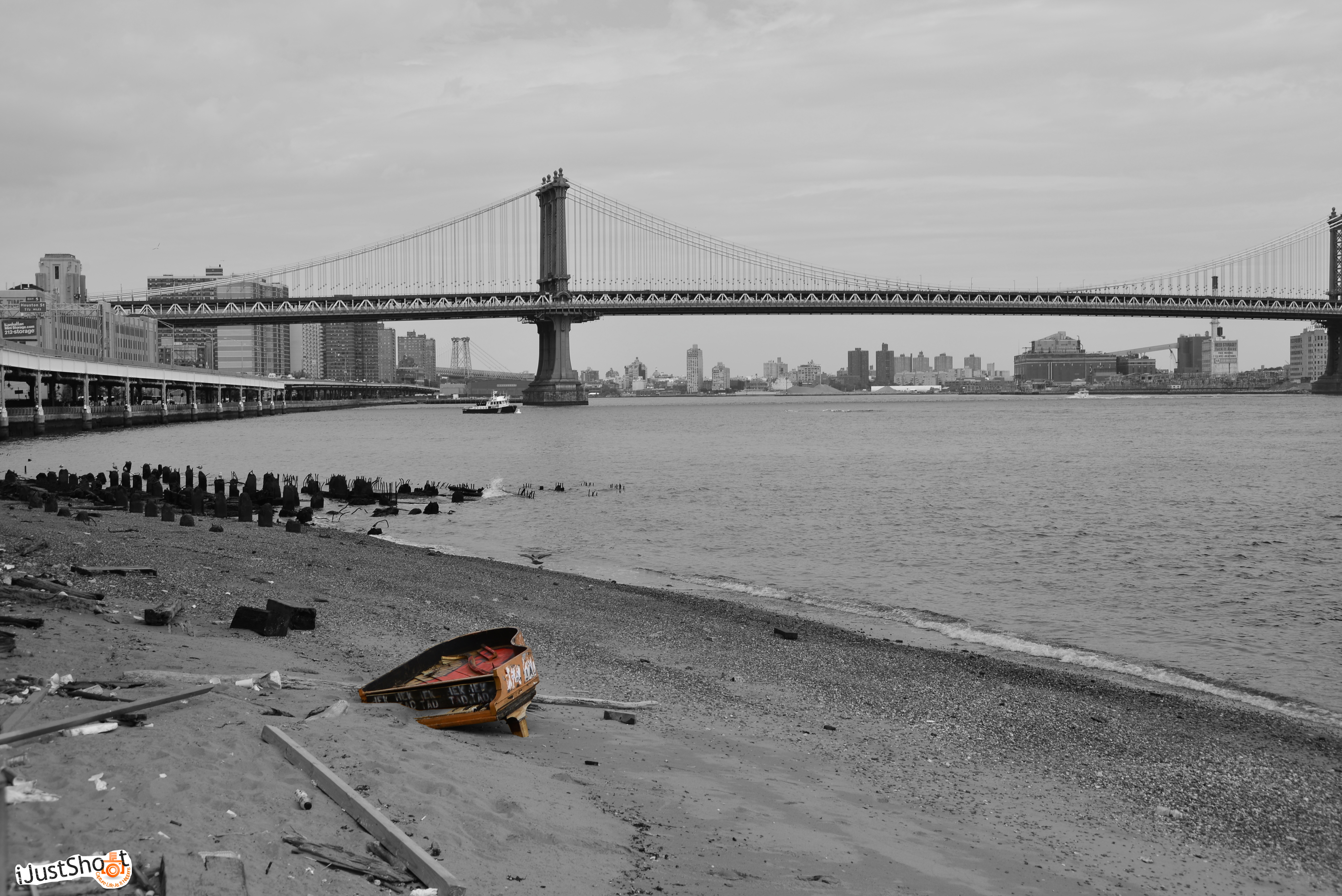 After spending most of my life in New York City, I’ve always thought of the junk I walked by or stepped over from day to day. However, after visiting the BK bridge for a shoot with an up-and-coming techno band, my perspective of NYC’s garbage has somewhat shifted. In this capture a not so beautiful baby grand piano is captured poking out of the sand under the BK bridge with the Manhattan Bridge and East River acting as a scenic backdrop. To make the piano (now garbage) pop once last time, I used the splash technique to add emphasis and bring attention to a once beautiful piece of art.